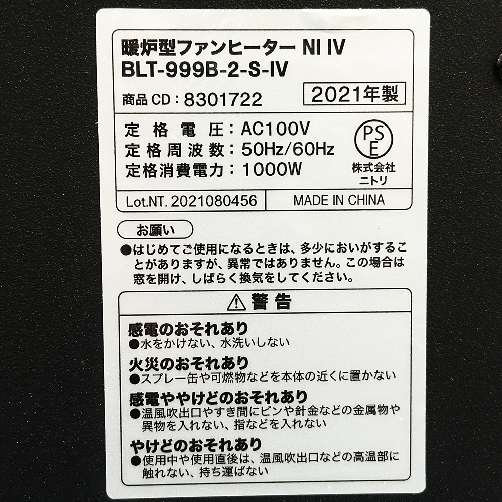 ニトリ 暖炉型ファンヒーター NI IV BLT-999B-2-S-IV(2021年製) をお持ち込みいただきました。