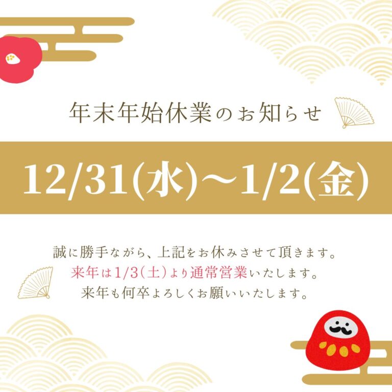 いつもご利用いただきありがとうございます。 年末年始の営業について、お知らせいたします。 12/30(火) 通常営業(10:00~19:00) 12/31(水) 店休日 1/1(木) 店休日 1/2(金) 店休日 1/3(土) 通常営業(10:00~19:00) よろしくお願いいたします。